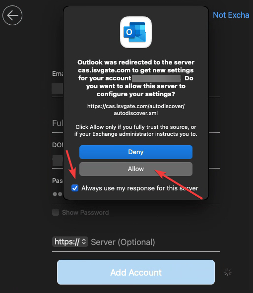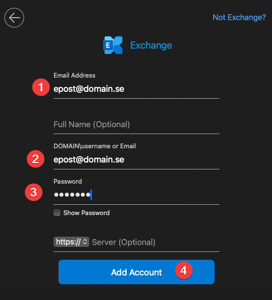I nästa ruta anger ni er e-post adress under DOMAIN\username or email och ert lösenord. Klicka sedan på add account