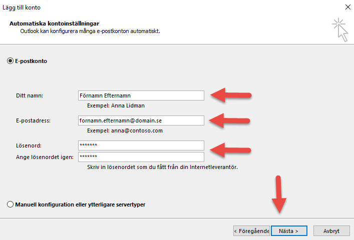 Skriv in ert förnamn, efternamn, e-post adress samt lösenord två gånger och klicka på ”nästa”