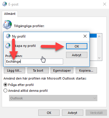 Namnge den nya profilen t.ex. ”Exchange” och klicka på ”ok”