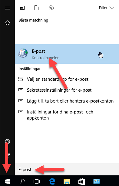 Tryck på startmenyn och skriv e-post i sök rutan och klicka på e-post ikonen.