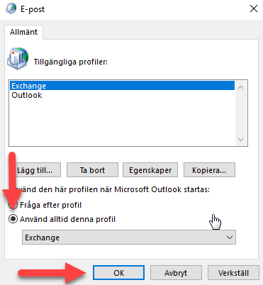 Klicka i rutan ”Använd alltid denna profil” och välj den nya profilen ni skapat i rullgardinen och klicka sedan på ”OK”.